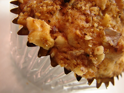 Despeje a mistura molhada na seca. Misture bem até ficar bem incorporado com uma espátula. Despeje na forma de muffins untada ou forrada com forminhas de papel. Misture 2 colheres de sopa de nozes com 1 colher de sopa de açúcar mascavo - eu deu uma "machucada" no pilãozinho - e jogue essa misturinha em cima de cada muffin. Asse por 20 minutes. Deixe esfriar numa grade.