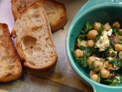 Fiz uma quantidade para duas pessoas. Cozinhe o grão de bico em bastante água, ou use um de lata de boa qualidade. Numa panelinha refogue meia cebola roxa numa colher de sopa de azeite. Quando a cebola estiver bem macia, acrescente um dente de alho picado e pimenta verde picada [eu usei pimenta vermelha em flocos]. Refogue mais um pouquinho, desligue o fogo e deixe esfriar. Separadamente tempere o grão-de-bico com bastante coentro picado, salsinha, ceboulette, raspinhas e suco de meio limão. Acrescente o molhinho de azeite, cebola e alho. Misture bem. Acrescente mais azeite a gosto e misture bastante feta cheese picadinho. Eu coloquei um pouquinho de sal, porque gosto de tudo mais salgado, mas não é realmente necessário, pois o sal do queijo se incumbe do serviço. Sirva com pita bread ou com fatias de pão italiano tostadas na frigideira de ferro, como eu fiz.