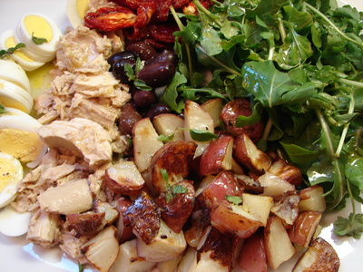Pique umas batatas em cubinhos, ponha numa forma coberta com papel alumínio, regue com azeite e ponha no forno alto por uns 15 minutos, até elas ficarem crocantes por fora, macias por dentro. No meio tempo das batatas acrescente tomates cerejas na forma, regue com azeite e deixe assar, ate eles ficarem molinhos - eu não tinha tomates frescos, usei uns secos bem macios que tinha, comprados no Farmers Market. Cozinhe os ovos, descasque e corte. Monte a salada com: atum de boa qualidade escorrido - eu temperei o atum com suco de limão e azeite aromatizado, folhas de rúcula, azeitonas pretas, os ovos cozidos, as batatas assadas e os tomates. Regue tudo com um molho vinagrete de limão e sirva.
