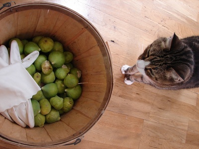 Para fazer o sorvete de figo foi super simples. Envolveu apenas algumas etapas que foram facilmente superadas. Primeiro fui dirigindo até a estação experimental de vegetable crops da UC Davis, onde tem uma figueira de ninguém dando sopa e muitos figos. Esses não são dos figos roxinhos, mas da variedade calimyrna, que é verde. Fui até a figueira munida de luvas e cesta, me espichei toda pra colher as frutas mais madurinhas—a árvore estava lotada, então já sei que ainda vou poder voltar lá mais vezes. A estação experimental fica no meio de um poeirão, com greenhouses de um lado, campos de milho e outros legumes do outro. Tem que ir de sapato fechado e tomar cuidado pra não pisar em figos podres e depois pisar na terra e pedregulhos. E tem que lembrar de checar as solas do sapato antes de entrar no carro.