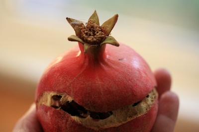 Quando as romãs começam a aparecer no mercado e na cesta é uma alegria imensa para mim. Não sei explicar porque eu gosto tanto dessa fruta, que é uma daquelas difícil de comer. Eu tenho o costume de abrí-las, guardar as sementes num tupperware e ir usando, geralmente para salpicar nas saladas salgadas ou na de frutas. Gosto do xarope de romã, que transforma qualquer molho de salada num evento especial e do suco, que está na moda por aqui. Nós compramos o puríssimo, que é o mais saudável, super ácido e bebemos em doses pequenas. A fazenda de pistachos, onde o Uriel testa a máquina dele todo final de verão, também produz romãs. Algumas são para exportação—o Japão recebe a maioria. Elas são as romãs mais perfeitas que eu já vi, gigantes e preciosas. Ele me trouxe uma outro dia. Essa fofurete vestindo coroa e tudo veio na cesta orgânica desta semana.