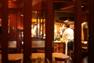 E fui. A hostess, extremamente delicada e gentil, me disse que seria trinta minutos de espera. Topei sem piscar. Enquanto o Uriel foi estacionar o carro, eu fiquei olhando os cozinheiros trabalharem na preparação do jantar do dia, no restaurante que fica na parte de baixo da casa. Dei uma espiada através da cortina e depois fiquei embasbacada, olhando o movimento na cozinha de um dos restaurantes mais famosos do mundo. Um dos cozinheiros escolhia talos de uma verdura, outros picavam coisas, a cozinha tinha um cheiro maravilhoso de coisas deliciosas. De repente entrou o chef Jean-Pierre Moullé, que comanda a cozinha do restaurante há anos. Ele inspecionou algumas coisas e foi sentar-se em uma das mesas com outras pessoas, certamente planejando a noite.