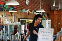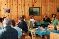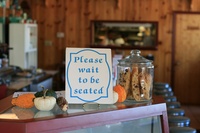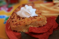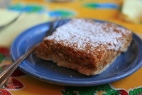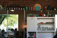 O que eu tinha ouvido falar é que o café era um lugar bem simples, com comida também simples, tipo cardápio de diner, só que feito pela família, com ingredientes fresquinhos e locais. A descrição bateu perfeitamente com a realidade. O restaurante é bem simples, serve café da manhã e almoço. Tem também um cardápio de tortas e biscoitos. Eu poderia descrevê-lo como a versão caseira e ultra-melhorada de um Denny's ou um Baker's Square. Chegamos um pouco depois da uma da tarde e eles não estavam mais servindo o café da manhã. Pedimos o almoço. Para beber, limonadas feitas de limão fresco espremido—coisa rara em diners de hoje em dia. O Gabriel pediu chá e veio uma variedade enorme do Tazo, realmente bem diferente do menu de chás de um diner comum. Pedimos nosso rango, que chegou prontamente. De onde estávamos podiamos ver o cozinheiro, muito compenetrado. Pedimos sanduíches, que vieram com sopa ou salada. O Uriel elogiou a sopa, onde se via os legumes e pedaços de carne. Nada a ver com as sopas enlatadas que são servidas abundantemente por aí. Eu pedi uma torta de milho feito com roasted chiles, milho fresco e cornmeal, servido com sour cream que estava simplesmente perfeita—úmida, macia e ultra-saborosa. Pedimos batatas fritas e eu mal pude acreditar naquilo: elas vieram super pelando, do jeito que eu adoro, crocantes por fora, macias por dentro e sequinhas! Batatas fritas simplesmente perfeitas. Tudo que saia da janela da pequena cozinha tinha uma cara simples, mas parecia delicioso. Quando chegou a hora da sobremesa estávamos tão cheios, mas eu quis pedir uma torta pra experimentar. Elas são todas feitas com frutas da estação, dos pomares da região. O Uriel escolheu a torta de damasco, que estava muito interessante, diferente e deliciosa. Vou querer voltar lá outras vezes para provar as outras tortas. E pra compensar todos esses anos que deixei de ir—vale mesmo a pena pegar a estrada!
