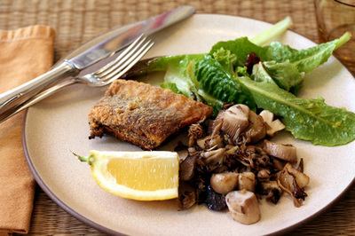 Um almoço cem por cento local—norte da Califórnia. O peixe é um leopard shark pescado em Bodega Bay, temperado com sal, pimenta branca, envolto no fubá e frito no óleo, servido com um gomo de limão do meu quintal. A salada são folhas verdes dos meus produtores favoritos no Farmers Market com as passas dos fazendeiros de Sanger, temperada com limão, azeite, sal. Os cogumelos são também do Farmers Market, do produtor japonês de quem eu compro cogumelos orgânicos todo sábado, eles foram refogados com alho da cesta orgânica da fazenda da UC Davis e azeite orgânico do Napa Valley. Se quiser esticar mais um pouquinho o esquema eat local, os pratos também podem ser considerados locais, pois são feitos manualmente em Sausalito, pela Heath Ceramics. Nota final do crítico, depois dessa refeição: estava excelente. me senti almoçando no Chez Panisse. ha ha ha ha ha!