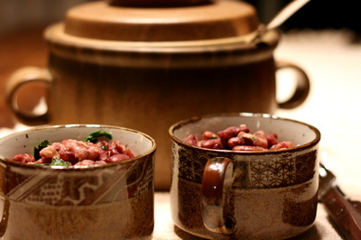 Para essa receita eu usei os cranberry beans, que deixei de molho na água de um dia para o outro. Cozinhei na panela de terracota em fogo baixo por mais ou menos uma hora. Os grãos devem ficar tenros, mas não podem desmanchar. Removi os grãos da panela com uma escumadeira e temperei com sal, pimenta do reino moída, um pingo de vinagre de laranja, bastante azeite e ervas frescas. Gosto da salsinha fresca no feijão, mas como só tinha coentro, foi coentro mesmo, que eu também adoro.