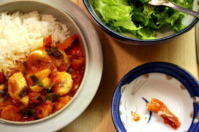 Refoguei um punhado de sementes de urucum numa boa quantidade de azeite. Deixei esfriar e removi as sementinhas. Adicionei cebolinha picadinha no azeite que ficou avermelhado pelo urucum. Usei a parte verde e a branca—minhas cebolinhas são gigantes, apenas uma bastou. Quando as cebolinhas estavam molinhas, acrescentei uma lata de tomate, deixei engrossar. Temperei com sal e pimenta vermelha seca. Quando o molho ficou grosso, afundei ali os camarões que tinham sido previamente temperados com sal, pimenta e suco de limão. Espremi por cima mais suco de limão. Cobri com rodelas de banana nanica e polvilhei com bastante coentro fresco. Tampei e deixei cozinhar por uns minutinhos apenas, com cuidado pros camarões não virarem chicletes borrachudos. Servi com arroz branco e uma salada simples de folhas de alface. Minha opinião sincera: os camarões poderiam ter ficado de fora. Só a banana já fez dessa moqueca o fino da bossa.