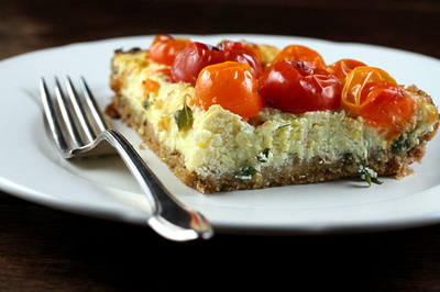 Pré-aqueça o forno em 450ºF/ 230ºC. Misture a farinha de pão com o azeite até formar uma farofa. Eu faço minha farinha na hora, com pão torrado ou bolachas integrais. Pressione essa farofa no fundo de uma forma de aro removível [daquelas de fazer cheese cake]. Numa vasilha misture bem a ricota, o queijo parmesão, os ovos, o sal e a pimenta e o manjericão picadinho. Espalhe esse creme sobre a massa de farinha de pão e azeite. Cubra tudo com os tomates e regue com um fio de azeite. Leve ao forno e asse por 35 a 45 minutos. Deixe esfriar, desenforme. Sirva morna ou na temperatura ambiente.