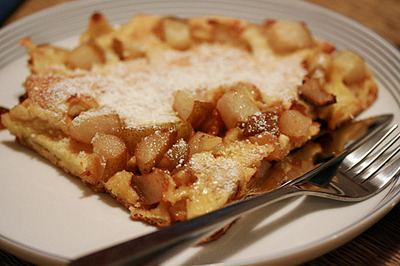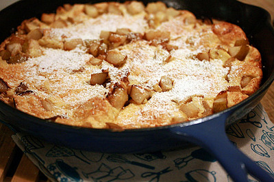 Pré-aqueça o forno em 425ºF / 220ºC. Numa frigideira de preferência de ferro e que possa ir ao forno, derreta duas colheres de manteiga. Coloque as pêras cortadas em cubinhos e refogue na manteiga. Acrescente uma colher de açúcar baunilhado. Enquanto isso bata no liquidificador os três ovos em velocidade máxima, Acrescente o leite, sempre batendo. Desligue, acrescente a farinha e ligue novamente em velocidade máxima. Por último coloque o extrato de baunilha. Quando as pêras estiverem douradas, desligue o fogo, jogue a massa batida por cima e leve ao forno. Asse por uns 20 minutos, ou até a massa crescer e ficar dourada. Retire do forno e polvilhe com açúcar de confeiteiro. Sirva em seguida.