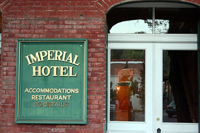 Para compensar o show de horrores que foi o nosso almoço no buteco da Susan, tivemos um jantar delicioso e elegante no Imperial Hotel em Amador City. A minúscula cidade de 150 habitantes abriga um restaurante realmente impressionável, pela qualidade da comida e serviço. O prédio construído em 1879 era um hotel para os mineiros, que infestavam a região durante a corrida do ouro. Hoje restaurado, o local ainda oferece hospedagem com seis quartos na parte de cima e o restaurante no andar de baixo. Tudo muito lindo, sem exageros, decoração e luz delicada, eu e o Uriel ríamos como bobos alegres, comparando as duas experiências do dia.