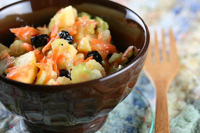 Fiz essa salada para poder usar um salsão magrelo que comprei no Farmers Market do sábado passado por nenhuma razão aparente. Muitas vezes eu compro legumes ou verduras por um impulso inexplicável. Foi assim então que o salsão de pernas longas e finas acabou na gaveta da minha geladeira. Juntou-se às maçãs, que abundam em variedades nesta época do ano é é quase impossível passar por elas—fresquinhas e cheirosas—sem levar algumas. As cenouras também estão aparecendo, lindas e doces. Juntei um punhado de black currant berries que eu tenho guardada na despensa já faz um tempo, e estava pronta a salada.