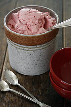 e vi à venda toneladas de damascos, cerejas, morangos e alguns tomates precoces. Acabei trazendo pra casa mais fruta do que poderíamos comer. Como não guardo fruta nenhuma [muito menos tomate] na geladeira*, não podemos ficar dando bobeira, esperando a fruta estragar. Principalmente se a fruta for morango. Comemos muitas al naturel, porque é assim que eu acho que aproveitamos muito mais o sabor de cada uma. E com parte do morango, reiniciei a temporada dos sorvetes. Para esta estréia, fiz um refrescante frogurt—frozen yogurt.