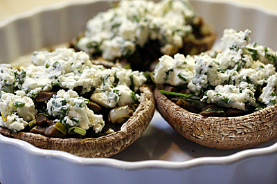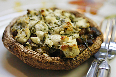 Da última vez trouxe pra casa três lindos portobellos, que preparei no forno. Retirei o caule e piquei em cubinhos. Numa panela refoguei o caule em cubinhos em azeite, juntei um alho-poró picadinho e um macinho de espinafre selvagem, também chamado de lamb’s quarters, que recebi na cesta orgânica. Um salzinho, uma pimentinha. Essa mistura virou um recheio para os portobellos, que ainda levou uma camada de queijo de cabra temperado com ciboulettes—chives e azeite. Forno médio por uns 20 minutos e está feito um jantarzinho muito simpático.