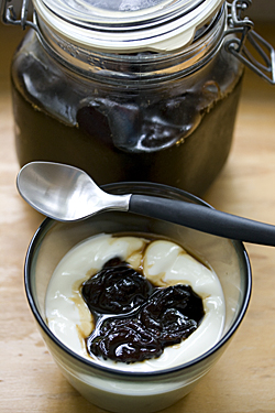Acredito que ele possa ser substituído pelo Sherry ou vinho do Porto. A Ximena diz que quanto mais tempo as ameixas ficarem imersas no xarope, melhor. Tive a santa paciência de esperar alguns dias para poder provar. O pote com as ameixas já está na geladeira há quase duas semanas. Realmente, o tempo é extremamente favorável neste caso. Eu tenho comido as ameixas com iogurte natural, mas elas também acompanham bem sorvetes ou pudins.