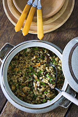 Quem disse que eu consigo passar pela banca dos cogumelos no Farmers Market sem comprar um pacotinho? Desta vez ataquei de shiitake e chanterelle. Na hora que compro não sei de nada. Depois penso o que fazer com eles. Cogumelos frescos são deliciosos! E com esses eu quis preparar um prato bem substancioso e decidi misturá-los com algum tipo de grão. Uma olhada geral na despensa revelou um restinho de trigo em grão [wheat berries] que mediu exatamente 1 xícara. Cozinhei essa xícara de trigo com 3 xícaras de água e uma pitada de sal em fogo baixo, até a água secar e o trigo ficar molinho. Numa frigideira refoguei cebola picadinha na manteiga e acrescentei os dois tipos de cogumelos, refoguei por uns minutos e salguei. Depois foi só misturar o trigo cozido com os cogumelos refogados, juntar bastante ciboulette picadinha e pronto. Eu servi morno, quase frio.