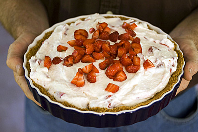 Essa torta de morango é o fino da bossa—deliciosa, refrescante e o tempo de preparo é de quinze minutos. Sim, QUINZE MINUTOS senhoras e senhores! Eu que sou uma atrapalhada e desajeitada consegui preparar tudo nesse meio tempo, enquanto finalizava o almoço. Se eu pude fazer, qualquer um pode. A receita original, que saiu na edicão de agosto de 2006 da revista Gourmet, levava blueberries. Mas eu tinha morangos e foi com eles então que fiz a torta.