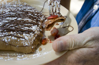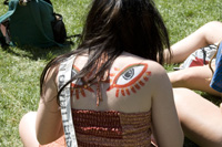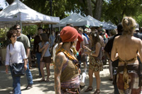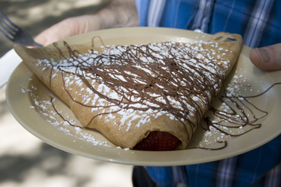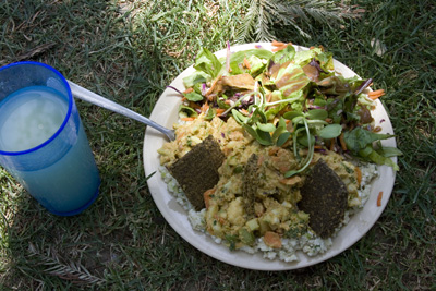 Três dias de música, paz e amor. Não estou falando de Woodstock, mas do Whole Earth Festival, que acontece todo ano no campus da UC Davis desde 1969. É um festival hippie, celebrando a diversidade e a vida alternativa. Todo ano é a mesma coisa, mas eu vou com o mesmo entusiasmo e como as delicias vegetarianas que eles vendem, ouço música ou discursos políticos e ambientais nos diversos palcos instalados pelo campus, olho as barracas de artesanato e o povo colorido. É um dos festivais mais populares e frequentados da universidade. Detalhes interessantes: toda a eletricidade, até a do palco principal onde as bandas grandes se apresentam, é gerada por energia solar. O festival produz ZERO de lixo, com seu programa eficientíssimo de reciclagem. Eles usam uma técnica muito legal de utensílios rentáveis. Você paga um dólar extra pelo copo, garfo ou prato, e recebe o dinheiro de volta quando retorna. A segurança e organização do festival é feita por um grupo de voluntários denominado Karma Patrol. Todos são bem-vindos, hippies, geeks, caretas, etc. Todos se vestem como querem, e dançam como querem pelo gramado do Quad. Toda a comida vendida nas barraquinhas do festival é vegetariana, vegana ou étnica. No Whole Earth Festival você vai ver de tudo, coisas que normalmente não vê no campus da Universidade da Califórnia em Davis, que é um campus muito mais sisudo e careta do que o de Berkeley, por exemplo. Nestes três dias de festa, a cidade se enche de Kombis psicodélicas e pessoas com roupas e cabelos coloridos. Eu vou sempre, pois adoro essa festa. Neste ano comi comida raw e vegana, como no ano passado. Era um curry de legumes crus, o arroz era repolho bem triturado, a salada tinha um molho delicioso e os crackers estavam incríveis. O Uriel comeu um sanduba de berinjela grelhada, nada excepcional. Bebemos limonada de gengibre adoçada com néctar de agave e de sobremesa dividimos um crepe integral recheado com morangos frescos e decorado com açúcar e nutella.