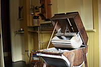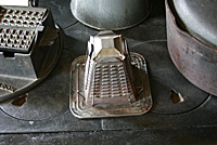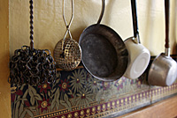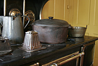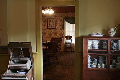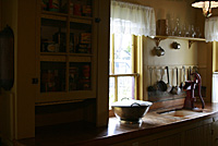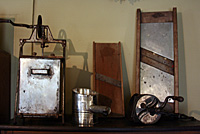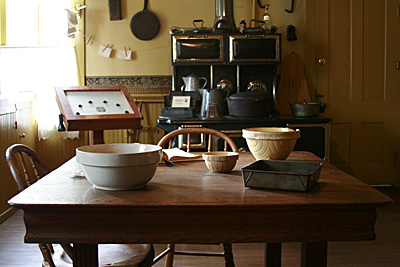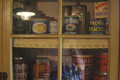 A cozinha da Astor House foi um caso à parte. Ficamos mais tempo lá dentro do que em qualquer outro cômodo da casa. Fiquei absolutamente encantada com a riqueza de detalhes, todos os armários devidamente estocados, utilitários, gadgets, lavadora de roupa, telefone, panelas, formas, até dois cortadores de dedo, ops, mandolines gigantes, que nos fizeram gargalhar—imagine eu usando um desses! O mais legal dessa cozinha, além de poder fotografar, é que pudemos mexer em tudo, abrir gavetas, folherar livros, xeretar em todos os cantinhos, até cheirar as especiarias numa lata grande de metal pintada a mão que acomodava várias latinhas com temperos. Fiquei rodopiando pela cozinha por um tempão, como uma galinha bêbada e depois que visitei o restante da casa, voltei para mais uma rodada de olhadas e bisbilhotadas. Não sei se eu gostaria de cozinhar numa cozinha dessas—bem moderna para a época, mas inviável para os nossos hábitos práticos de século 21. Cozinhar dava muito trabalho! Mas o empenho de preservação da história é algo fascinante. Imagino que a maioria das pessoas que visita esse tipo de museu se concentra mais em outras partes da casa, como as salas, os quartos, a biblioteca. Mas eu, se não vejo a cozinha e a despensa, fico realmente frustrada. Nesse passeio que fiz ao Colorado, pude visitar duas cozinhas de duas casas do século 19—a chiquérrima da ricaça Molly Brown em Denver e essa pensão simples, porém incrívelmente equipada, em Golden.