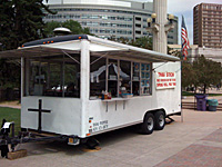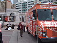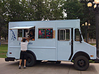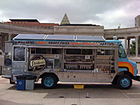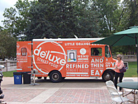 No dia que fui ao Museu de Arte de Denver, resolvi deixar minha câmera no hotel pra não ficar carregando peso inútil. Quando cheguei numa praça com cara de anfiteatro romano, que era caminho do museu, dei de cara com uma feira de comida. E a maioria dos vendedores usavam os food trucks, que eu acho o maior charme. Eles tinham todo tipo de comida, dos hamburgures e hot-dogs, até crepe franceses, comida chinesa, mexicana, tailandesa, barbecue tradicional do sul, sanduiches leves, bolinhos, eteceterá, eteceterá. Caminhei pela feira e não comi nada, porque ainda era cedo e meu objetivo era chegar logo ao museu. Mas não pude deixar de fotografar, com o iPhone mesmo, alguns dos caminhões. Trés charmant, oui?
