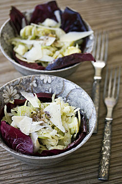 Misture a alcachofra picada com o salsão e erva-doce. Tempere com 1 colher de sopa de azeite. Em vasilhas individuais coloque o radicchio picado, a mistura de alcachofra por cima e decore com o queijo parmesão. Tempere cada porção com o restante do azeite, mais o balsâmico e sal e pimenta. Sirva.