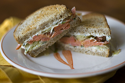 Nem sou uma pessoa que come sanduiche o tempo todo. Raramente substituo um prato de comida por um sanduba. Isso eu gostava de fazer quando tinha meus vinte anos. Mas tem dias que só dá tempo de fazer um tostex de queijo, o que pra mim é praticamente o fundo do poço em termos de alimentação. No dia em que minha hora do almoço foi um samba do crioulo doido, montei esse sanduíche super rapidinho e sem nenhuma culpa. Ficou tão bom que repeti a dose no jantar [abafa!]. Não quero de jeito nenhum incentivar ninguém a consumir salmão poluído de fazenda, mas se acharem um bom salmão selvagem, não percam essa oportunidade. Usei o King do Alaska. Aqui encontramos salmão defumado em fatias finíssimas e também em postas grossas. Eu gosto mais do que vem em postas e foi esse que usei.