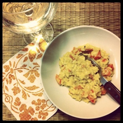 A receita de risoto é sempre a mesma—1 xícara de arroz, 1 xícara de vinho branco, 3 ou 4 xícaras de caldo de legumes. Refogue um pouquinho de cebola picada num fiozinho de azeite, junte o arroz arbório, depois mais ou menos 3/4 xícara de cenouras assadas picadinhas, depois o vinho, depois o caldo, uma xícara de cada vez, e no final coloque um pedaço de queijo de cabra e tempere com sal. Pra servir bem quente e imediatamente. Mas não me incomodo de requentar [e comer] as sobras no dia seguinte.