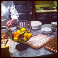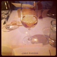 O menu da noite incluiu um aperitivo de prosecco ariomatizado com marmelo e laranja e uma torradinha com um patê de bacalhau negro. A seguir veio uma tortinha super leve e delicada com massa folhada recheada com carangueijo Dungénes, erva-doce, alho poró e uma salada de chicória. O primeiro prato foi um risoto de camarões do Golfo com cogumelos chanterelle, alho verde e olio nuovo. O segundo prato foi o peito de pato de Sonoma com um molho de laranja e mandarin, blinis de raiz de salsão e salada de agrião. A sobremesa foi fondant de chocolate com sorvete de gengibre. As sobremesas do Chez Panisse sempre são o ponto alto da refeição pra mim, porque elas são incríveis. Pra finalizar vieram dois biscoitinhos e café pro meu marido. Eu bebi duas taças de sauvignon blanc da vinícola californiana Quivira que estava perfeito e combinou com tudo o que comi.