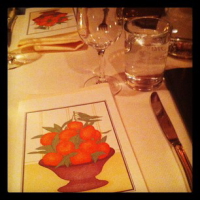Foram várias idas ao Café, mas ainda não tinhamos experimentado o Restaurante Chez Panisse, que fica no andar de baixo da casa da Shattuck Avenue, em Berkeley. O Uriel tinha tentado fazer uma reserva pro meu aniversário e não conseguiu, acabou reservando no Café mesmo. Para comemorar os nossos 30 anos de casados ele tentou novamente e desta vez conseguiu. Fiquei temerosamente de olho no menu, que é fixo e que eles publicam online semanalmente, para ver se não iria ter que encarar coisas que normalmente não encaro, como ostras, mariscos, polvo, patê de fígado, carnes exóticas e tals. Felizmente o ingrediente menos simpatico do menu daquele dia seria peito de pato. Respirei aliviada.