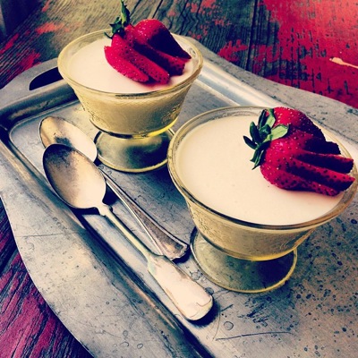 Fui à um restaurante em Woodland jantar com uma amiga numa noite de semana quando o local ofereceu um menu de três pratos com preço fixo. Estava tudo super gostoso, mas nos encantamos com a sobremesa—uma panna cotta feita com mel local. Woodland produz muito mel, como resultado das milhares de caixas de abelhas usadas para fazer a polinização das plantas, principalmente da cultura das amêndoas. Desde que me mudei pra essa cidade nunca mais comprei outro mel, além desses locais. E para fazer essa panna cotta usei um mel de lavanda com um sabor ultra-delicado. A que comi no restaurante era feita somente com creme de leite. Mas decidi usar essa receita com iogurte grego, que também fica muito boa. O iogurte adiciona um toque pungente ao creme, que eu gosto muito.