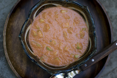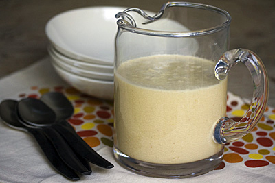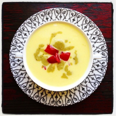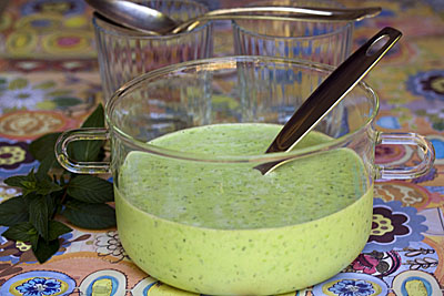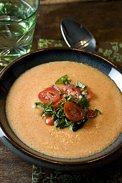 Este ano estou muito inclinada à fazer sopas frias. Achei algumas receitas interessantes numa revista Gourmet de agosto de 2006 que estava soterrada numa pilha de revistas que fica no meu banheiro—este ano também estou mais do que inclinada, estou realmente decidida, à organizar as centenas de revistas espalhadas pela casa.