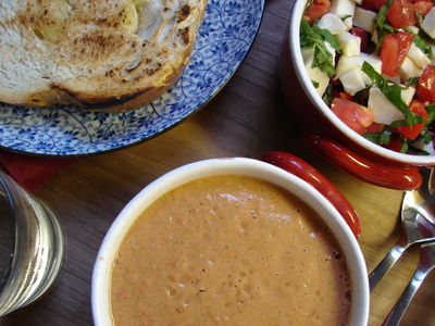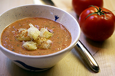 Bati no liquidificador 4 tomates orgânicos maduríssimos, 1 pimentão vermelho pequeno, uma cebola bem pequena, 4 azeitonas pretas, um punhado de salsinha fresca picada e duas fatias de pão francês de ontem amolecidas em água gelada. Bati bem, acrescentei uma xícara de água gelada, pimenta do reino moída, flor de sal a gosto e bastante azeite de oliva. Coloquei tudo numa jarra e deixei gelar. Servi com croutons simples, feitos com fatias finas de pão francês cortadas em cubinhos e tostados na frigideira de ferro, e regados com um fio de azeite.