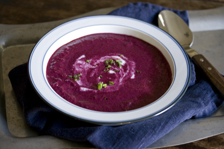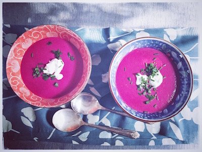 Essa sopa fria de beterraba estava impressa num pequeno livro de receitas que veio com um liquidificador Waring, que Pollock e sua esposa Lee Krasner compraram no final da década de 40. Era uma das receitas favoritas deles. Eu fiz e levei na minha marmita pro almoço no trabalho. Quando mostrei toda animada pros meus amigos russo e tcheco, eles protestaram uníssonos de que essa receita não era do borscht autêntico. Segundo eles, o real deal levava mais ingredientes, como batata, e tinha que cozinhar por muitas horas eteceterá. Meu contra-argumento foi que essa era a versão do Jackson Pollock, um artista criativo. Autêntica ou não, era o de menos. O que importava é que essa sopa é facílima de fazer e fica linda e deliciosa! Encerramos o assunto. Hahahaha!