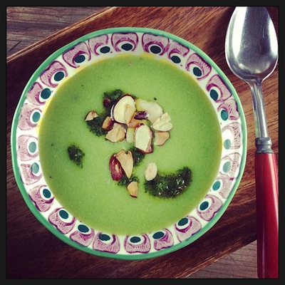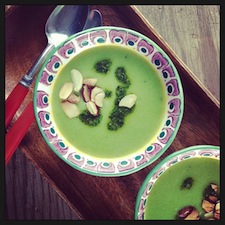 O Farmers Market de Woodland só reinicia na próxima semana, então minha fonte de ingredientes sazonais tem sido basicamente a minha cesta orgânica e o mercadinho da road 16, onde vou todos os sábados comprar ovos caipiras e frutas da estação. Mas como resistir a um pacote de ervilhas tortas fresquinhas por duas míseras patacas? Por isso tenho comido muita salada com elas, cozidas levemente no vapor. Nesta semana fiquei com um monte acumuladas e juntando com um outro tanto das maravilhosas favas que têm vindo na cesta orgânica, resolvi fazer uma sopa fria inspirada por esta receita que saiu na edição de maio da revista Sunset. Como eu já tinha os legumes cozidos, foi só preparar o azeite e tostar as amêndoas rapidamente na frigideira. Eu cozinho as ervilhas e as favas por alguns minutos em água fervendo, escorro, guardo ou uso a seguir.