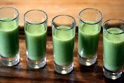 Claro que sobrou um monte de aspargos que a Madame Exagero fez pro brunch de domingo. Nem pensar em desperdiçar tais beleuzuras. Como os aspargos já estavam cozidos no vapor e temperados com sal e azeite, apenas piquei e bati no liquidificador com um pouco de água. Passei pela peneira, jogando mais um pouco de água, até obter um creme. Levei ao fogo até ferver, acertei o sal, desliguei o fogo e acrescentei um pouco de half-and-half [*para fazer em casa misture 3/4 xícara de leite integral com 1/4 de xícara de creme de leite fresco]. Servi morno em copinhos, como se fossem shots. Também pode servir frio.