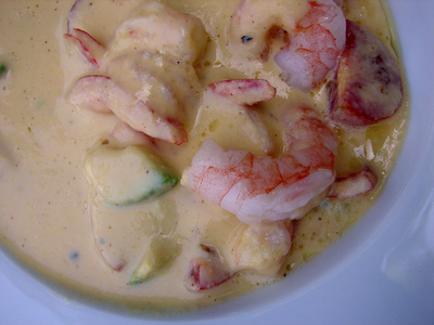 Bata no liquidificador o milho com o iogurte, leite, suco de limão, coriander, cayenne até virar um purê. Passe para uma sopeira através de um coador bem fino, para retirar todo o resíduo do milho. Misture o camarão, adicione sal e pimenta a gosto, misture os tomates e o abacate e sirva. Eu servi com torradas feitas na frigideira de ferro com um fio de azeite.
