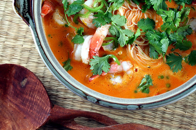 Refogue o camarão rapidamente na wok com um pouquinho de óleo de canola, sal, pimenta e o pimentão raladinho. Remova e reserve. Bata no liquidificador na velocidade mais baixa o leite de coco, leite de arroz, suco de cenoura, pasta de curry vermelha e a manteiga de amendoim. Remova para uma sopeira e leve à geladeira para gelar. Enquanto isso cozinhe o vermicelli conforme instruções no pacote. Junte as ervilhas, se forem congeladas. Coe tudo para uma vasilha e reserve. Na hora de servir junte o vermicelli com as ervilhas e os camarões refogados ligeiramente com o pimentão na sopeira. Tempere com shoyo e decore com o coentro. Sirva com colher e garfo.